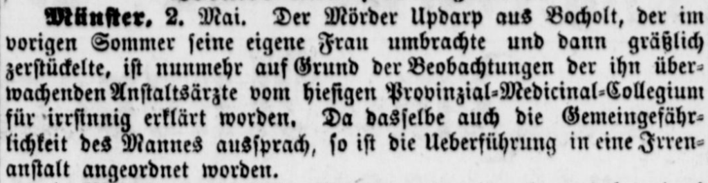 Die verstörenden Neuigkeiten verbreiteten sich in Windeseile und versetzen die Bocholter in Fassungslosigkeit. Bernard war zwar als „der Dulle“ bekannt, aber er stand nicht im Ruf, zu Gewalt zu neigen. Auch war er dem Alkohol nicht über Maßen zugeneigt. Noch am Vorabend hatte man ihn im Sonntagsanzug auf der Straße gesehen. Einige meinten, Bernard wäre vom Teufel besessen.