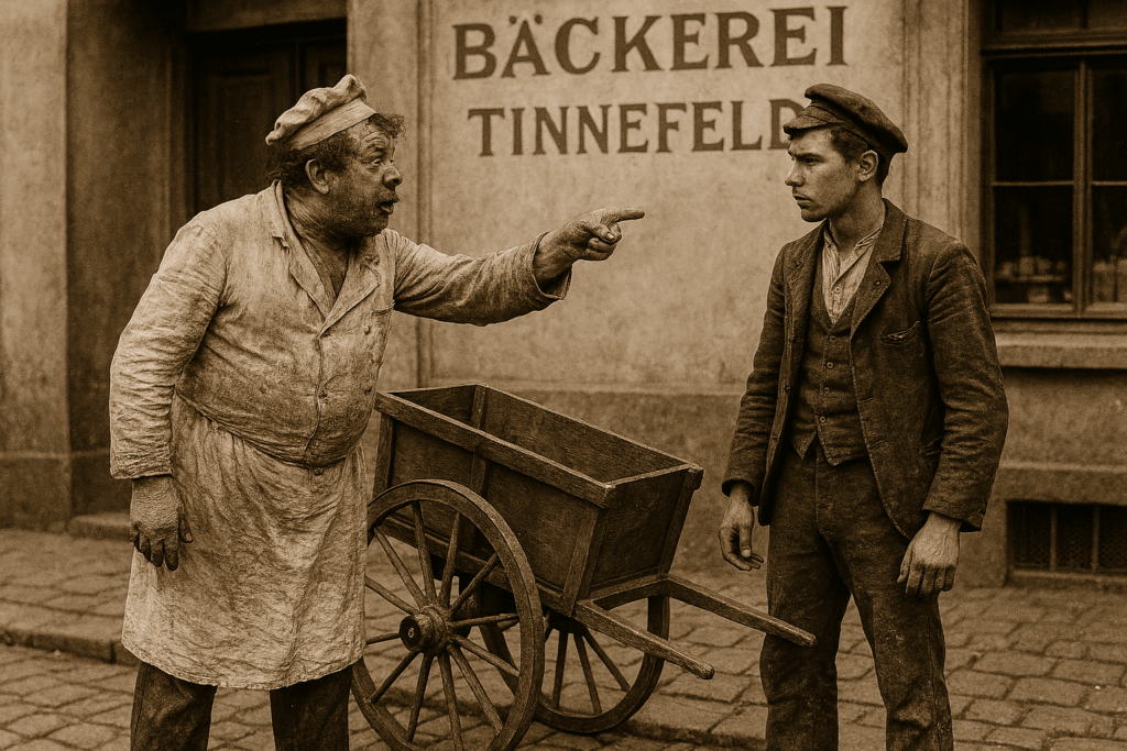 Auch an diesem Samstag war er wieder einmal schon mittags in die Stadt gegangen, um sich dort einen anzutrinken. Dabei vergaß er wie so oft die Zeit, so dass er erst gegen 17 Uhr zurückkehrte. Nun mußte es schnell gehen, denn in Kürze sollten die 39er kommen und es war noch nichts vorbereitet. Aber ausgerechnet jetzt stellte sich sein Stiefsohn Heinrich wieder einmal äußerst bockig an. Dabei sollte er doch nur den Handwagen saubermachen. Heinrich gehörte nicht zu den hellsten Köpfen und das brachte den Bäcker immer wieder in Rage. Was er aber vor allem nicht ausstehen konnte war, dass sich seine Frau Helena Terfrüchte immer wieder schützend vor ihren Sohn stellte und für ihn Partei ergriff.