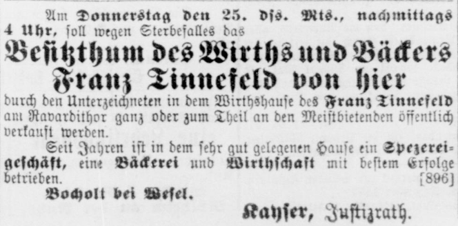 Seit Anfang der 1880er Jahre betrieb Tinnefeld in Bocholt am Ende der Ravardistraße eine Bäckerei mit angeschlossenem Krämerladen und einer Wirtsstube. Ganz in der Nähe hatte bis vor wenigen Jahrzehnten noch das zur Rawerspurte gehörende Pförtnerhäuschen gestanden. Inzwischen waren aber die Relikte der alten Stadtbefestigung nahezu vollständig verschwunden. Stattdessen platze Bocholt mit seinen rasch wachsenden Textilfabriken mehr und mehr aus seinen alten Nähten. Die stark wachsende Bevölkerung in Bocholt mußte mit dem täglichen Brot versorgt werden. Auch die angeschlossene Gaststätte schien gut zu laufen in der aufstrebenden Kleinstadt mit ihren durstigen Arbeiterkehlen. Die wirtschaftlichen Voraussetzungen waren also gut, wenn – ja, wenn Tinnefeld nicht allmählich auf die schiefe Bahn geraten wäre.