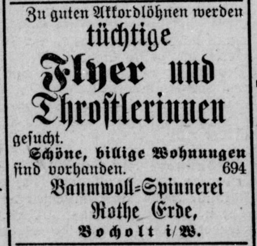 Zur Inbetriebnahme der Rothen Erde wurden gezielt Fachkräfte aus anderen Hochburgen der Textilindustrie angeworben. Infolgedessen zog die neue Fabrik hunderte Arbeiter aus allen Himmelsrichtungen nach Bocholt. Einer von ihnen war der Arbeiter Bernhard Röhring aus Vreden.