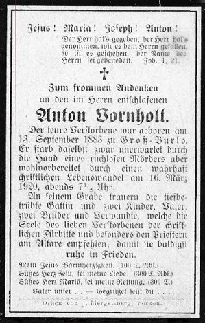Johann Anton Joseph Vornholt wurde am 16.09.1883 in Großburlo Nr. 29 auf dem Hof Schrieveshoff geboren. Seine Eltern waren Bernhard Vornholt (*06.01.1851) und Johanna Elisabeth Altena (*21.02.1849 +11.12.1913). Am 14.06.1910 heiratete er die am 06.01.1888 in der Oedinger Bauerschaft Nichtern geborene Maria Catharina Lütjann.