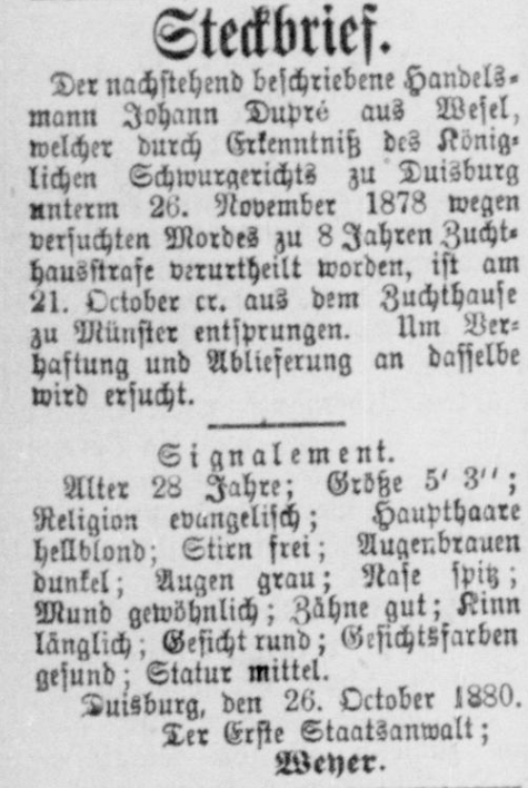 Seine Zuchthausstrafe führte Dupre nach Münster in das neue Gefängnis, das um diese Zeit als eines der modernsten Gefängnisse in Deutschland galt. Wer ihn aber nach Haftantritt sicher hinter Schloss und Riegel wähnte, sah sich schon knapp 2 Jahre später getäuscht. Am 21.10.1880 gelang ihm die Flucht aus dem Münsteraner Zuchthaus. Während der darauffolgenden Tage vagabundierte Dupre durch die Region, um dann am 26.10. in einer Weseler Schenke am Bahnhof plötzlich aufzutauchen. Den Wirt begrüßte er mit Handschlag, um sich dann sogleich einen Schnaps zu bestellen. Dieser erkannte Dupre zwar nicht, aber geheuer war ihm die Sache dennoch nicht. Also schloss er vorsichtshalber die Hintertür seines Hauses ab. Dies wiederum blieb Dupre nicht verborgen, so dass er sofort wieder die Flucht ergriff, als ihm der Schnaps gebracht wurde.