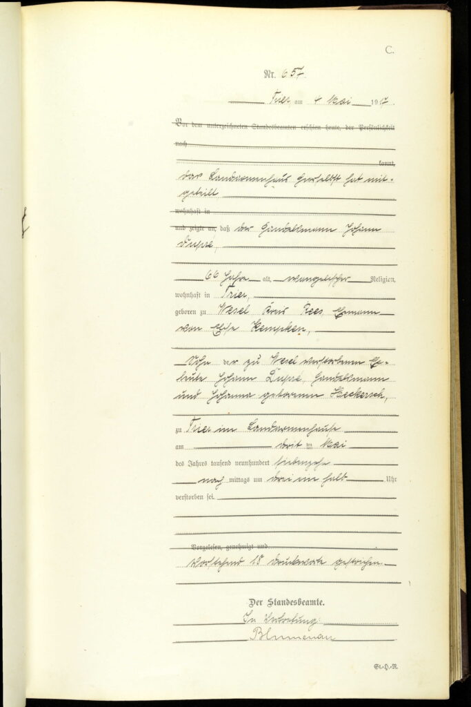 Dies war Dupres letzte Haftstrafe bevor er seine letzte Reise auf der irdischen Welt antrat. Dies war zugleich die weiteste Reise seines Lebens, die ihn in das Landarmenhaus nach Trier führte. Dort starb Johann Dupre am 03.05.1917 im Alter von 65 Jahren, wovon er etwa 20 Jahre im Gefängnis verbrachte. Die Sterbeurkunde nennt noch seine hinterbliebene Frau Elise Kemken. Die unglückliche Frau überlebte ihren Mann um 3 Monate. Sie starb am 16.08.1917 in Wesel im Alter von 68 Jahren. In ihrer Sterbeurkunde ist der Wohnort ihres Mannes als unbekannt angegeben.