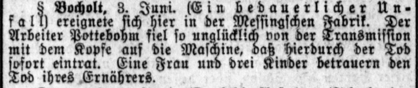 In der Familie Pottebohm dauerte es noch ein paar Jahre, bis es wieder einen Grund zum feiern gab. Am 14.10.1905 war es Gerhard Pottebohm selbst, der heiratete, und zwar Anna Maria Göring. Das Paar wohnte in der Unteren Blumenstraße 29 in der Bocholter Feldmark und hatte drei Kinder. Arbeit fand Pottebohm er in der Putzwollfabrik Messing am Westend. Es sollte allerdings keine vier Jahre dauern, bis das Schicksal erneut zuschlug. Am 02.06.1909 hatte er in der Fabrikhalle Arbeiten an der Transmission zu verrichten. Dabei stürzte er in die Tiefe, schlug mit dem Kopf auf eine Maschine auf und starb noch an Ort und Stelle im Alter von nur 30 Jahren. Am 05.06.1909 wurde er auf dem Bocholter Friedhof begraben.