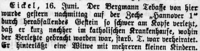 Alt wurde Clemens jedoch nicht, denn am 14.06.1904 traf ihn das Schicksal. Er wurde er Opfer eines Grubenunglücks. Herabfallendes Gestein traf ihn so schwer am Kopf, dass er am gleichen Tag im Katholischen Krankenhaus in Eickel starb. Er erhielt ein christliches Begräbnis in der Gemeinde St.-Marien in Eickel und hinterließ außer seine Witwe Josephina Färber noch zwei Stiefkinder, die beiden jüngsten Kinder aus ihrer früheren Ehe. Josephina Färber war hingegen ein wesentlich längeres Leben beschieden. Sie starb hochbetagt im Jahr 23.06.1930 in Wanne-Eickel.